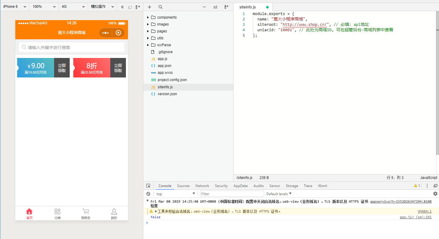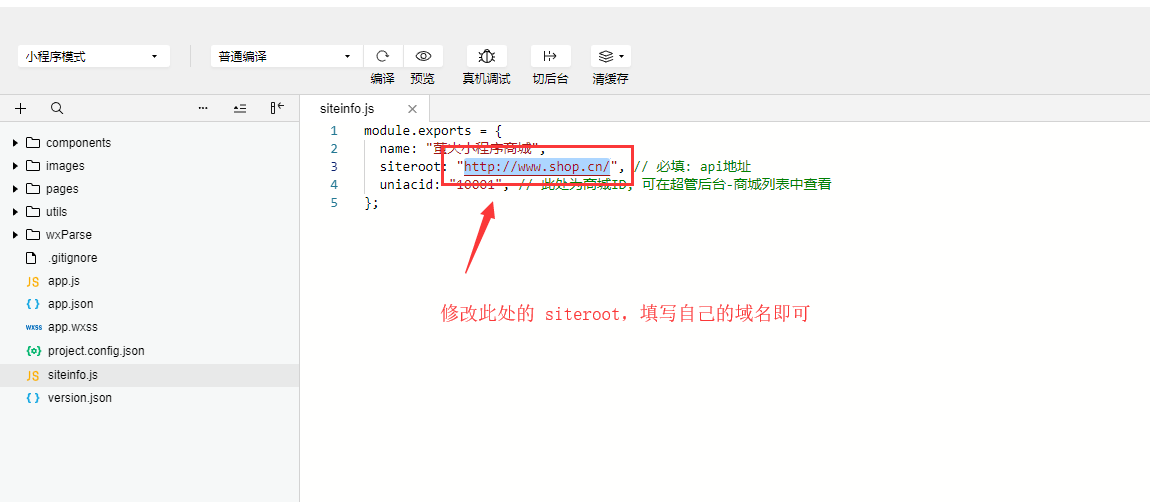 修改siteinfo为您项目的域名,注意域名格式不要错,域名后面要有斜杠/,例如:https://www.shop.cn/