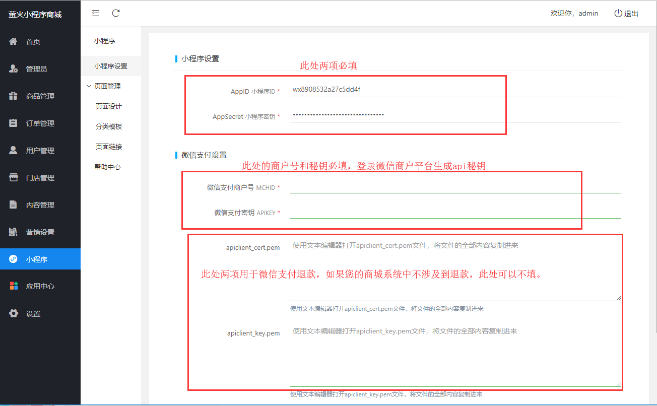 `AppID` 和 `AppSecret` 必须填写,用于请求微信的官方api。`微信支付商户号` 和 `微信支付密钥` 必须填写,用于使用微信支付。(微信支付商户平台-api秘钥设置)`apiclient_cert.pem` 和 `apiclient_key.pem` 用于操作微信支付退款,如果您的商城不涉及退款的操作,可不填此项。
