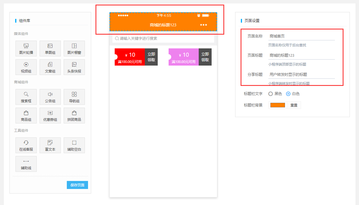 可在该页面修改小程序端的页面元素、顶部导航栏和标题等信息,可自定义DIY排版。