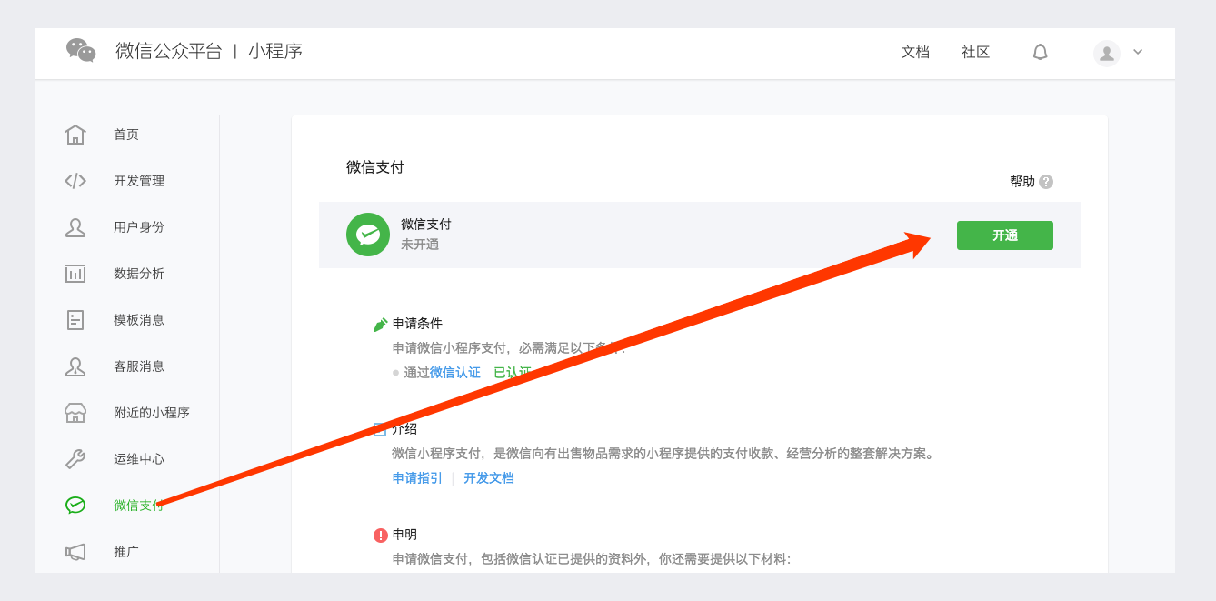 目前开通微信小程序支付功能有两种方式,一个是你已经有微信商户号的情况下直接绑定一下商户号就可以了,另一个就是需要新申请一个微信支付的商户号。